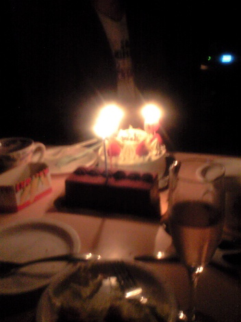 ケーキ。20って書いたろうそくが光ってる。