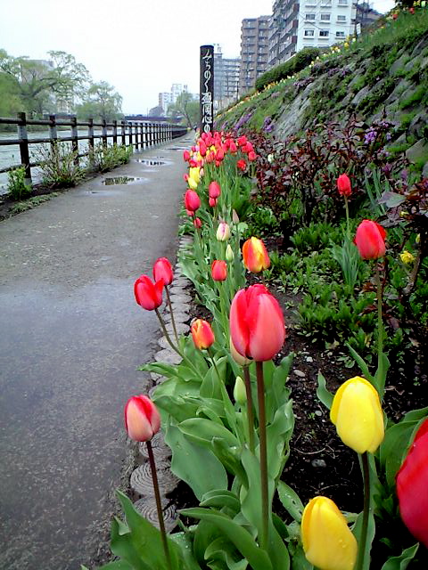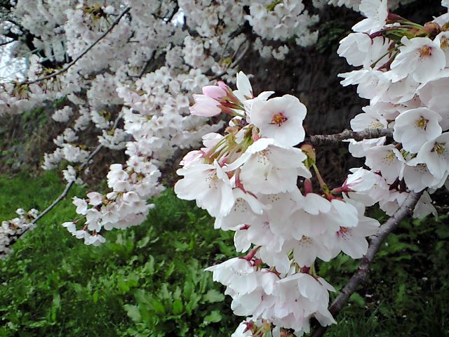 川原ダッシュ中にぱしゃり。このケータイもいいかんじに写真が撮れてうれしい。川原の上にある道路に生えている木だが、川原まで枝をたらしているので、私の胸元くらいにこんなに咲いてはるのです。