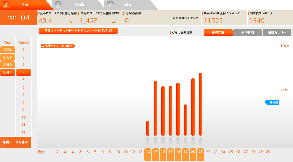 不審に思いつつもついったで#RunWalkをみると皆様消費カロリーが断然高い。何が違うのだろう…やっぱ遅いんだろうな。